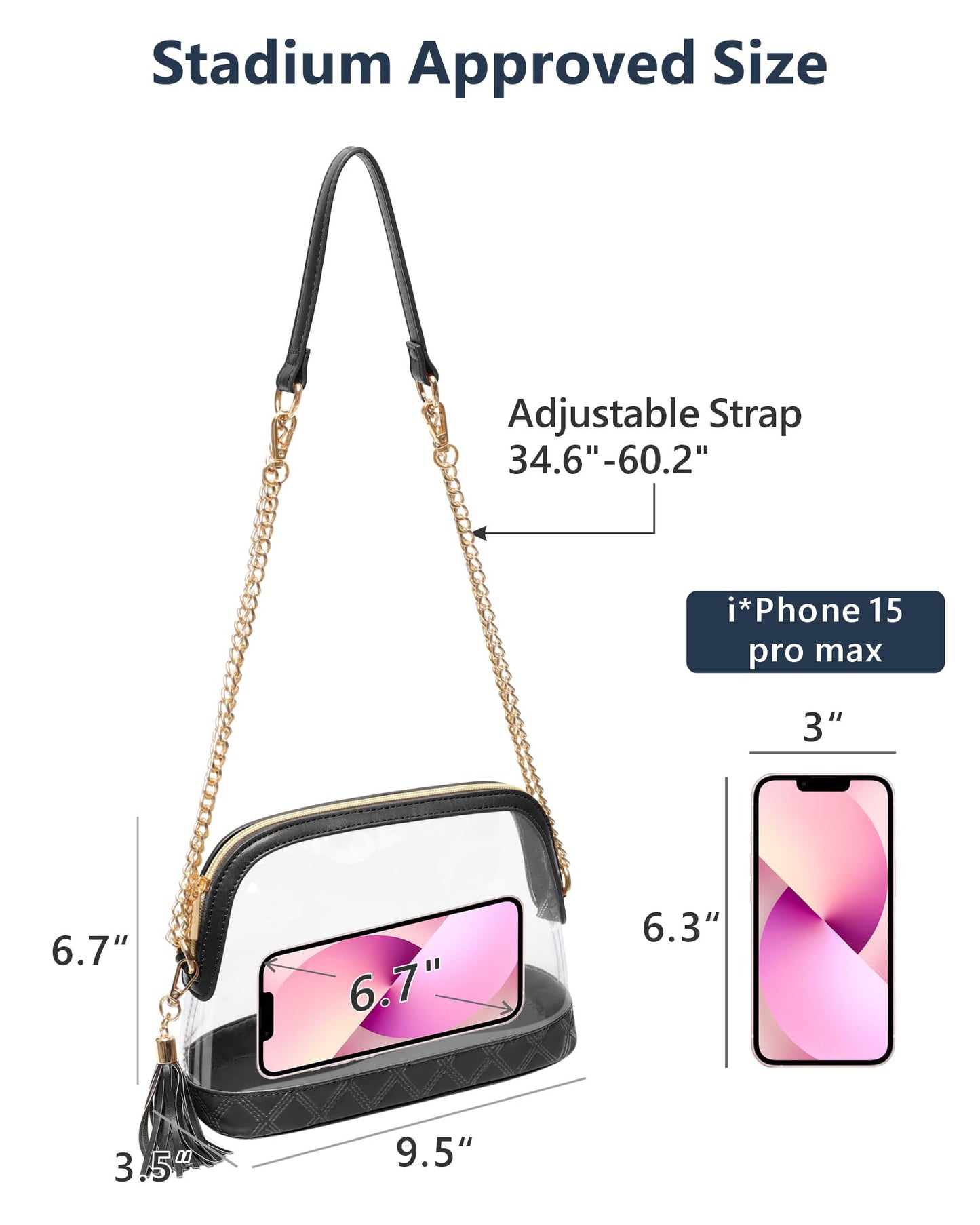 - Stadium Approved: Perfect sized of clear game day bag 9.45" x 3.54" x 6.69", it meets stadium clear bag policy requirements. The clear crossbody bag’s PVC faux leather construction ensures durability and adheres to the clear concert bag standard for hassle-free entry.