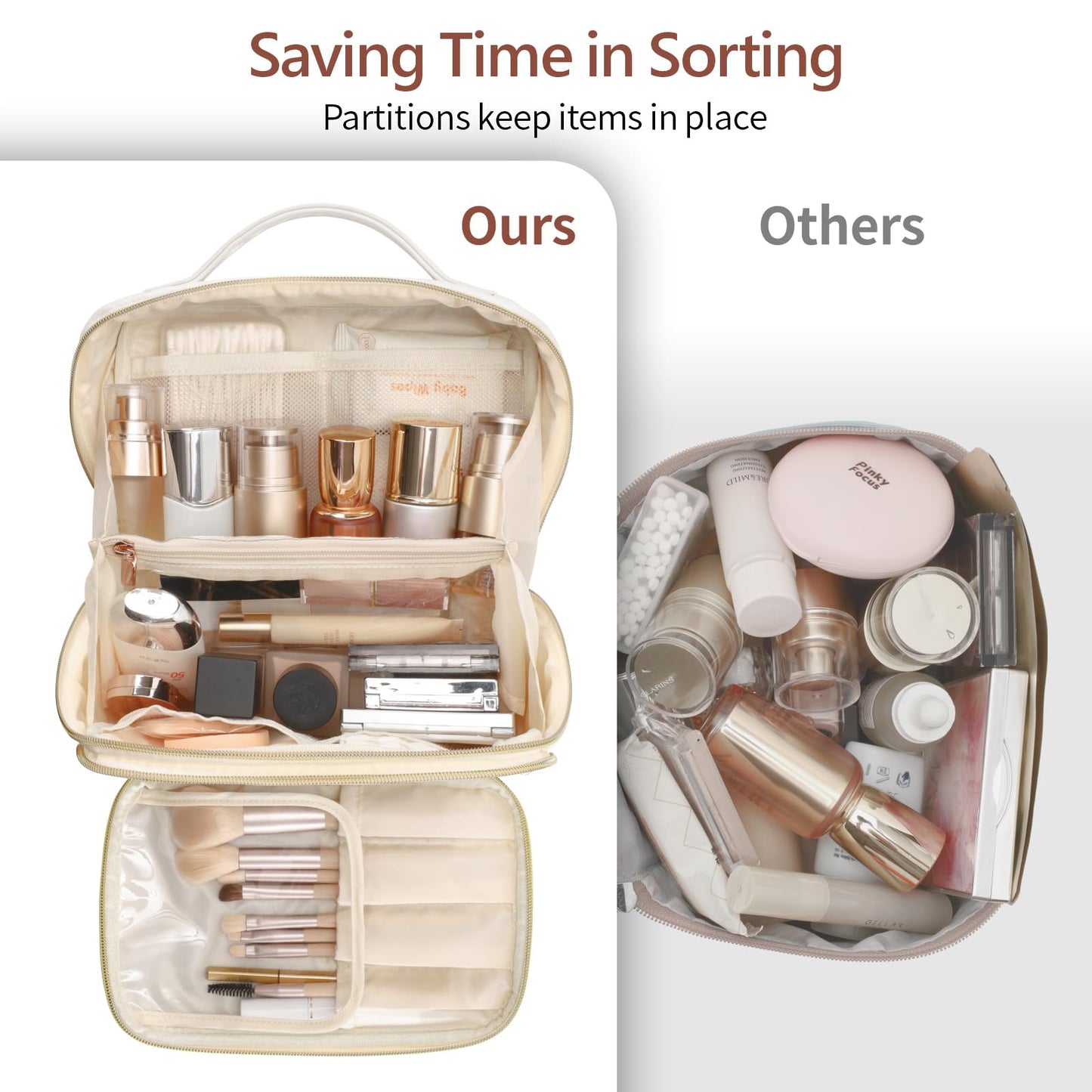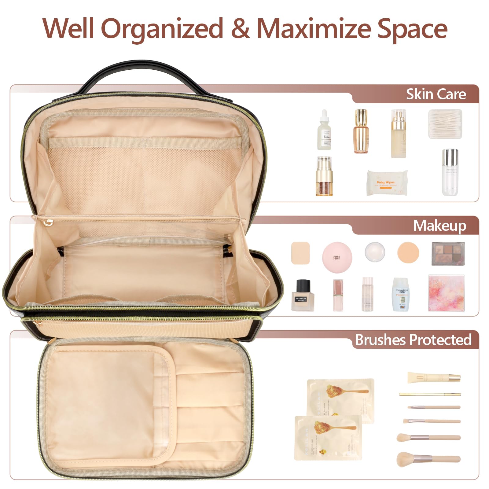 - Smart Design & Easy To Use: The open flat allows the cosmetic bag to be spread out on the countertop, instantly turning into 3 large pockets. All items are clearly visible for easy access. Two-way metal zippers for easy open. Grab and Go handle for easy carrying. Let your journey start!